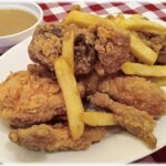 Breaded crispy chicken fried in butter with our special gravy and French fries.