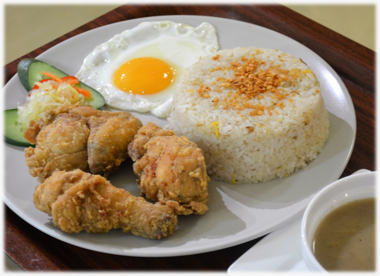 Crispy fried chicken with garlic fried rice, fried egg, soup and water