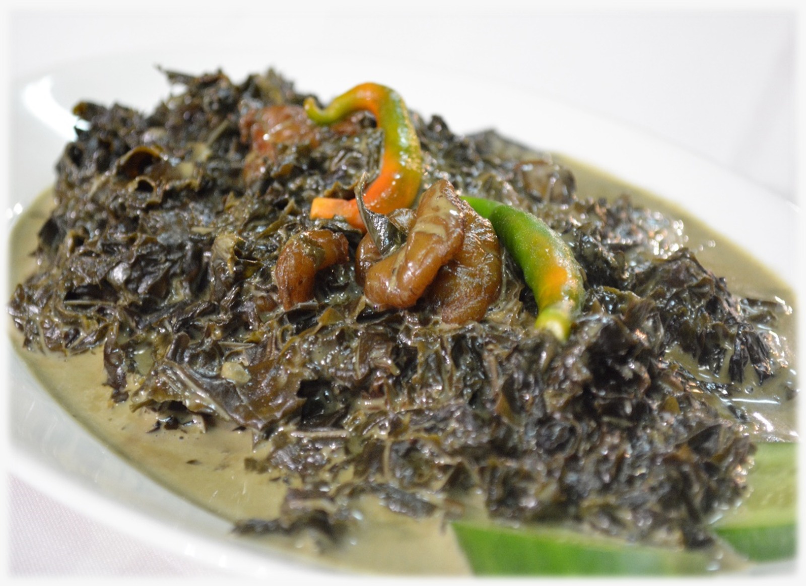 Taro leaves stewed in coconut milk.